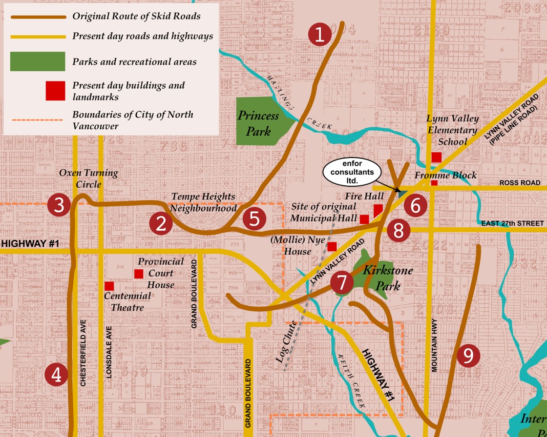 Long before commercial logging commenced as a local business in Lynn Valley in 1885 (once called Shake Town), logs were being harvested here and transported to the shore of Burrard Inlet by way of the routes shown on the adjacent map.