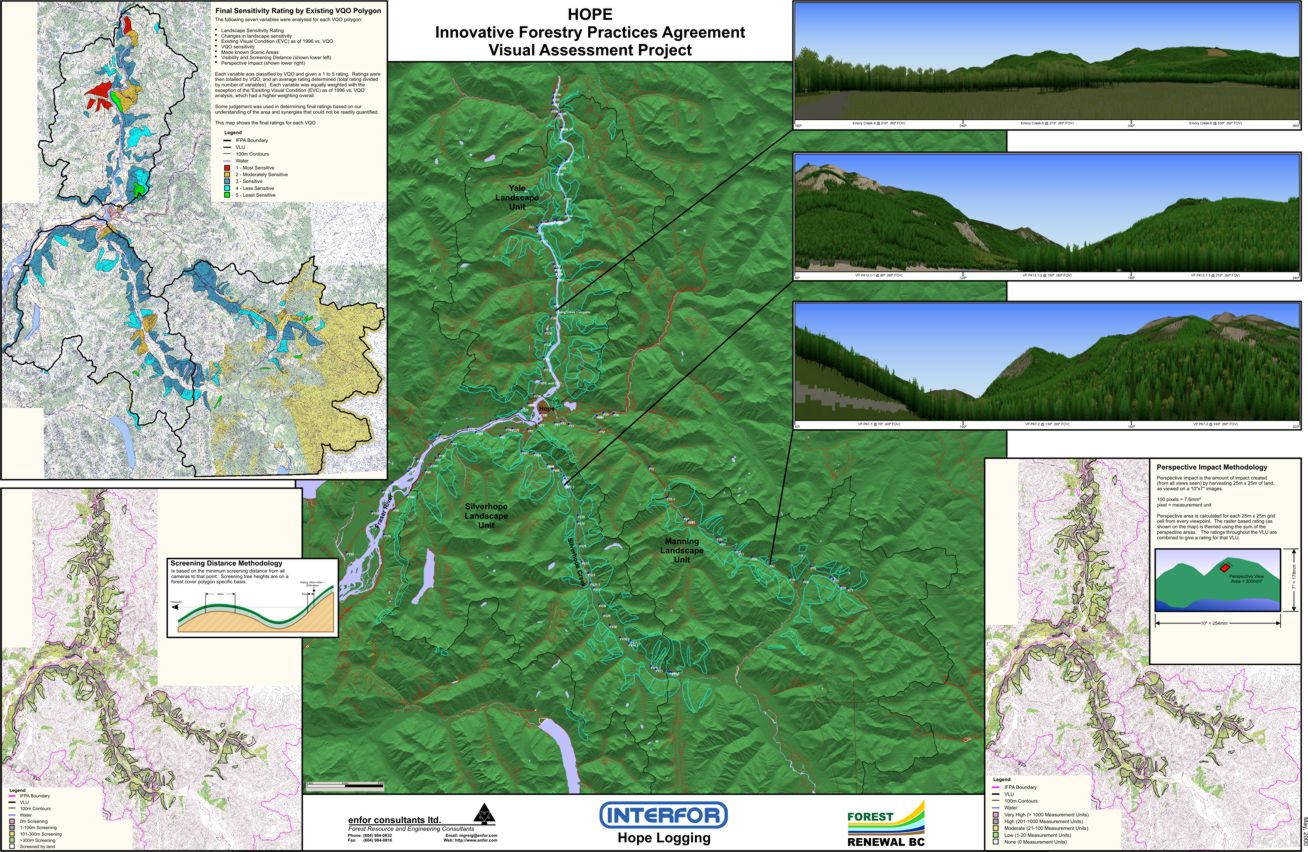The following is a recent example of innovative analysis of visual resource values used in timber supply analysis for the Hope Innovative Forest Practices Agreement area in the Fraser Canyon near Hope, BC. The project covered three landscape units.