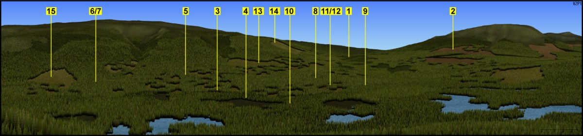 Several viewpoints portray the development over time. Four views are shown here (VP 2, 3, and 8 at treetop levels; VP 8 approximately 1000m above treetop). Examples of various objectives are labelled; refer to the list of objectives for the reference to examples.