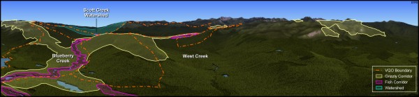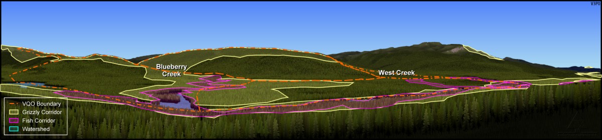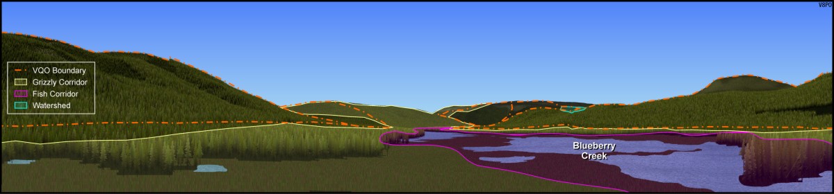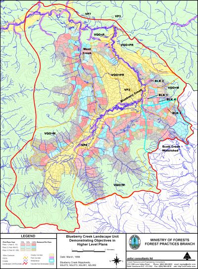 This demonstrates graphically the existing and potential future condition of the Blueberry Creek Landscape Unit under one development scenario; other options could be similarly tested during preparation of objectives, and to describe graphically the future condition of the area. This long term harvesting concept is a conservative example of the flow of resource management objectives and strategies between planning levels in the Blueberry Creek Landscape Unit.